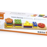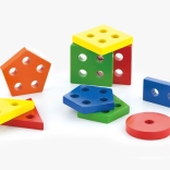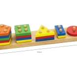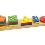 Deze stevige houten inlegpuzzel combineert het sorteren en op de pinnen rijgen van vormen. Kinderen leren kleuren en geometrische vormen onderscheiden, oefenen de oog-handcoördinatie en verbeteren hun behendigheid bij het hanteren van de onderdelen. Het hout is glad geschuurd en de kleuren zijn helder en aantrekkelijk.