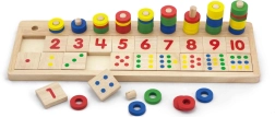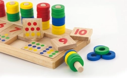 Het speelgoed is gemaakt van ecologisch hout, wat veiligheid en aangenaam gevoel bij aanraking garandeert. Dankzij de gemakkelijk verwijderbare tegels met cijfers kunnen kinderen ook eenvoudige wiskundige sommen zoals optellen en aftrekken leren.