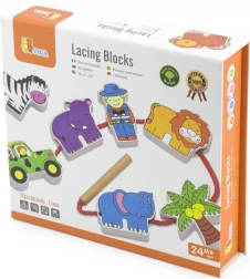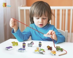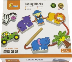Prachtige en kleurrijke rijgblokken van het merk Viga, ideaal voor de ontwikkeling van de fijne motoriek en de oog-handcoördinatie bij kinderen. De set bevat 12 blokken met safarimotieven en een extra koord voor leuk rijgplezier.