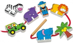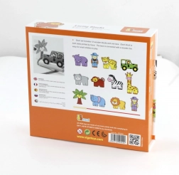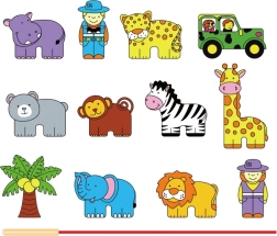 De set bevat houten blokken die safaribewoners afbeelden, waaronder een luipaard, palmboom, aap, nijlpaard, zebra, jeep, giraffe, beer, leeuw, olifant en gids. De blokken zijn aan beide zijden zorgvuldig beschilderd met niet-giftige verven en zorgen voor veel speelplezier. Alle elementen zijn ontworpen om de ontwikkeling van de fijne motoriek en kennis van de dierenwereld te stimuleren.