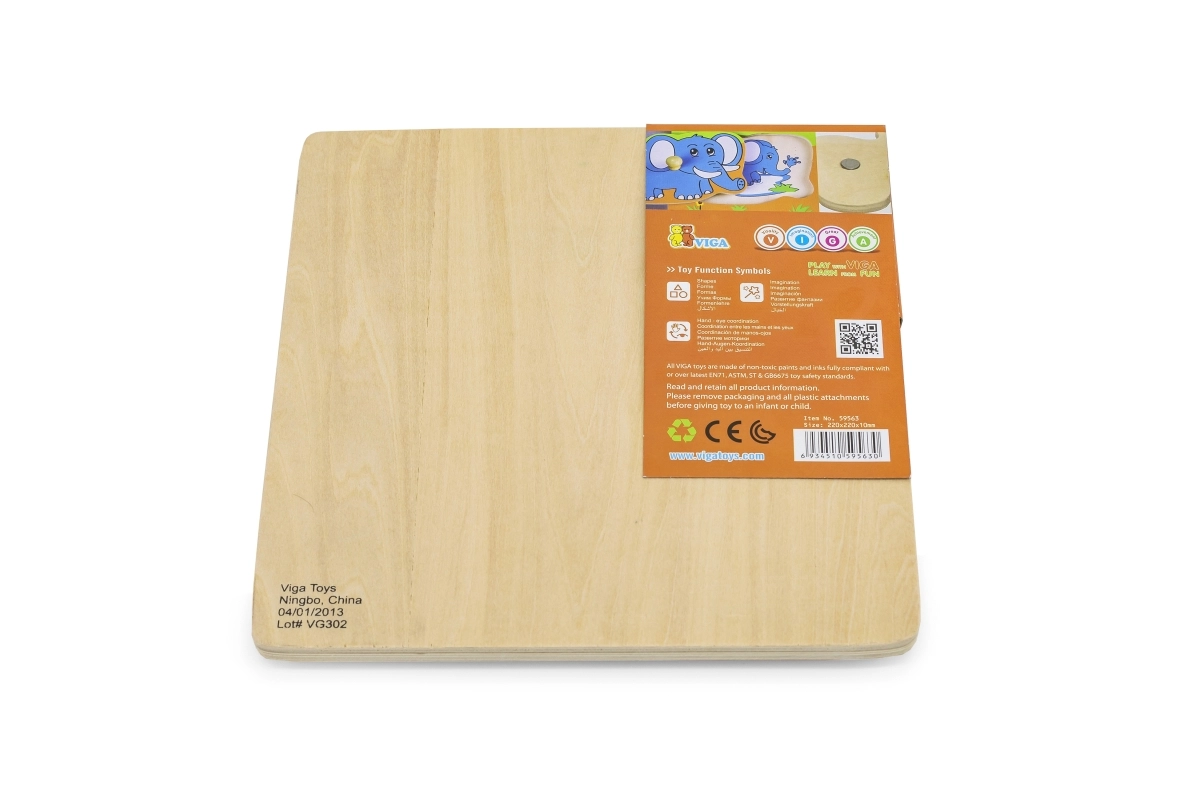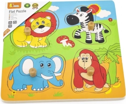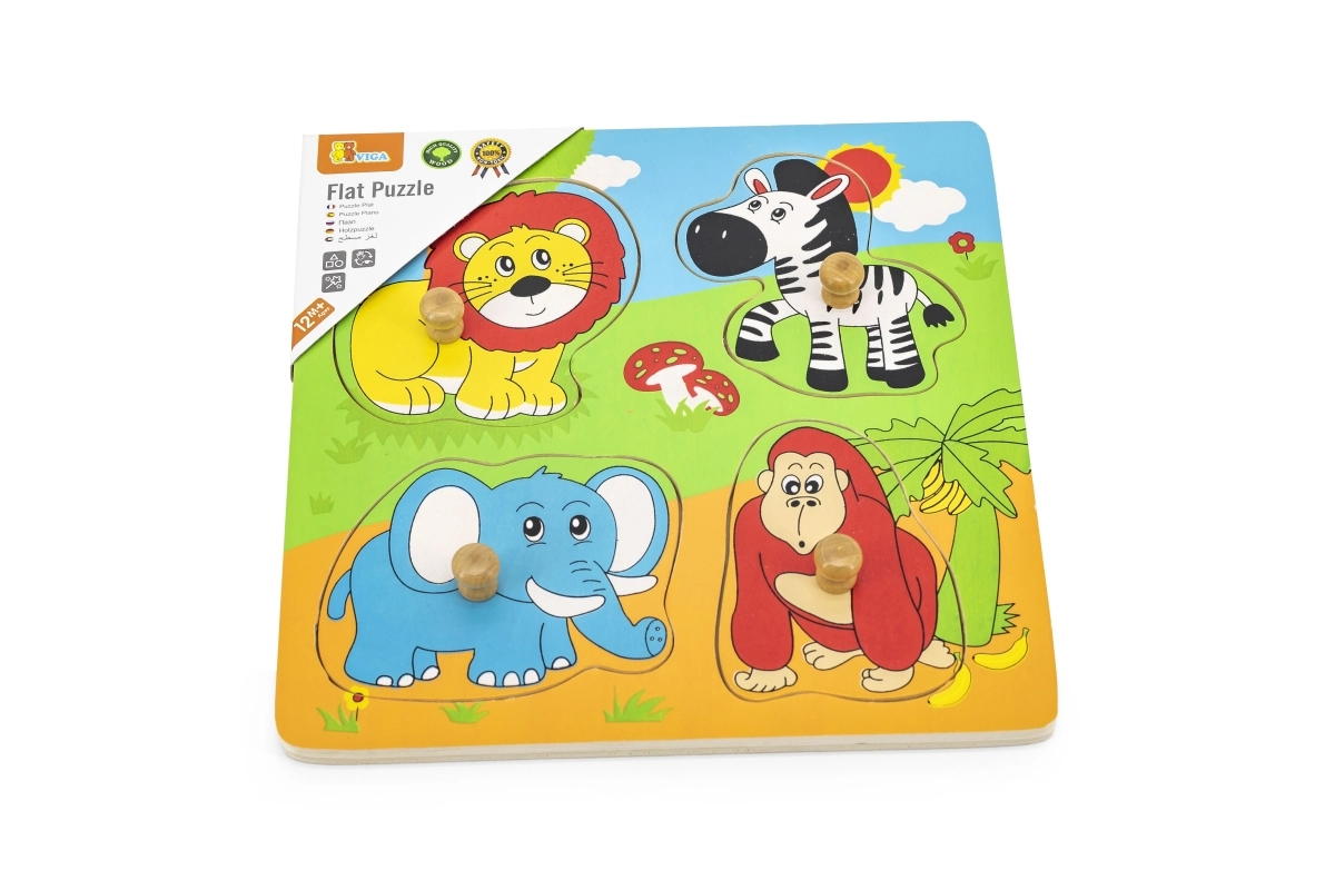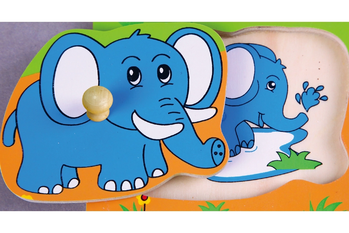 Deze kwalitatieve houten inlegpuzzel met safarithema is een ideale eerste puzzel voor peuters. Elk stukje heeft een houten knopje voor gemakkelijk vastpakken met kleine handjes en een passende silhouetvorm op de onderplaat voor eenvoudige oriëntatie.