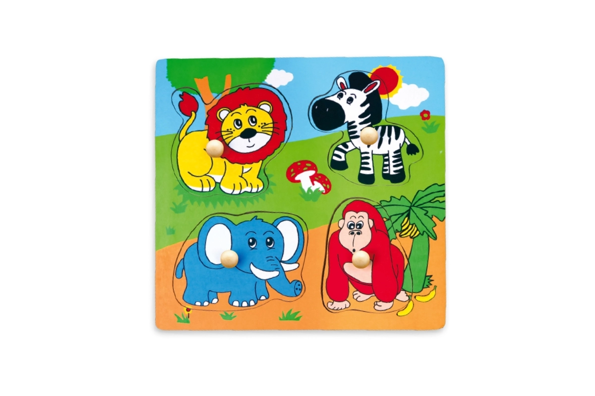 Ontdek de eerste puzzel voor de allerkleinsten: een houten safari-inlegpuzzel met handige knopjes. Stimuleert de fijne motoriek, oog-handcoördinatie en herkenning van vormen en dieren. Het kleurrijke design en de veilige afwerking zijn ideaal voor kinderen vanaf 12 maanden.