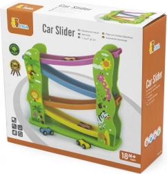 Deze prachtig gekleurde houten glijbaan is perfect voor de allerkleinsten die willen spelen en tegelijk hun vaardigheden ontwikkelen. Hij bevat een baan met meerdere niveaus in verschillende kleuren en laat de autootjes soepel over het parcours rijden.