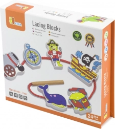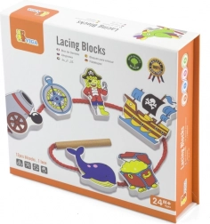 Ontdek de magie van een piratenavontuur met een kwalitatieve houten rijgset. Gekleurde blokken met motieven zoals piraat, schip of anker motiveren kinderen tot creëren en helpen spelenderwijs de greep, concentratie en het geduld te trainen. Door het rijgen aan de veter oefenen kinderen nauwkeurigheid en coördinatie, terwijl ze zich uitstekend vermaken.