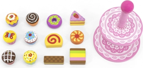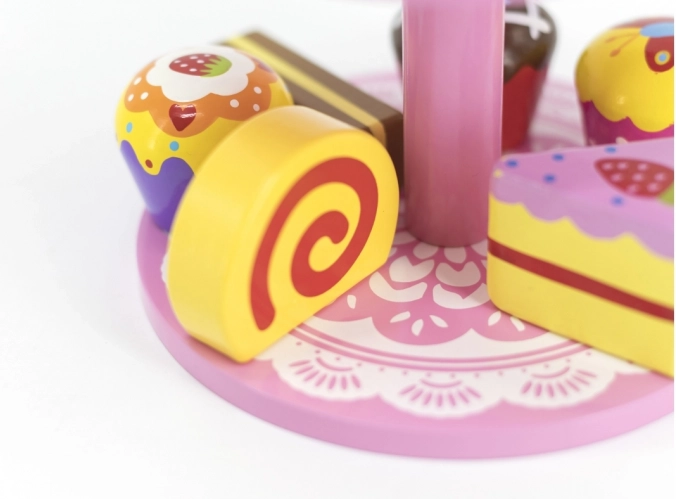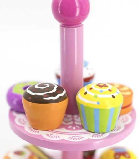 Ontdek deze schattige set voor de kinderkeuken: een tweelaagse standaard met kleurrijke houten desserts. De set bevat 12 taartjes en een stevige roze standaard die creatief spel, fijne motoriek en sociale vaardigheden stimuleert voor kinderen vanaf 18 maanden.