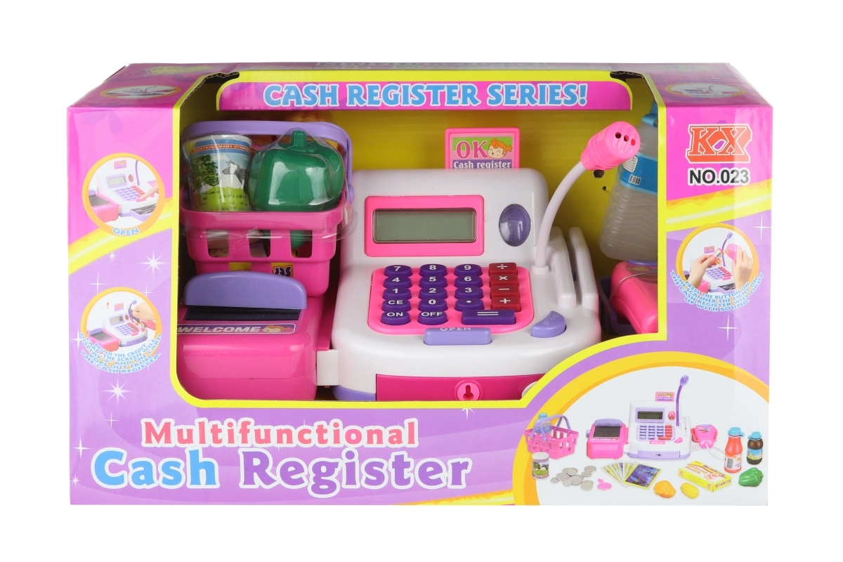 De kassa is uitgerust met een transportband, scanner en een lade voor muntjes. Kinderen oefenen zo basisrekenen, communicatie en sociale vaardigheden. Voeding via 2× AA-batterijen (niet inbegrepen).