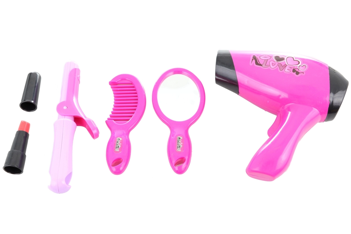 Deze roze beautyset biedt kinderen alles wat ze nodig hebben voor de eerste kappers-experimenten. De föhn, gevoed door 1× AA-batterij (niet inbegrepen), wordt aangevuld met een krultang, kam, handspiegeltje en cosmetische accessoires – allemaal aangepast aan kleine kinderhanden.