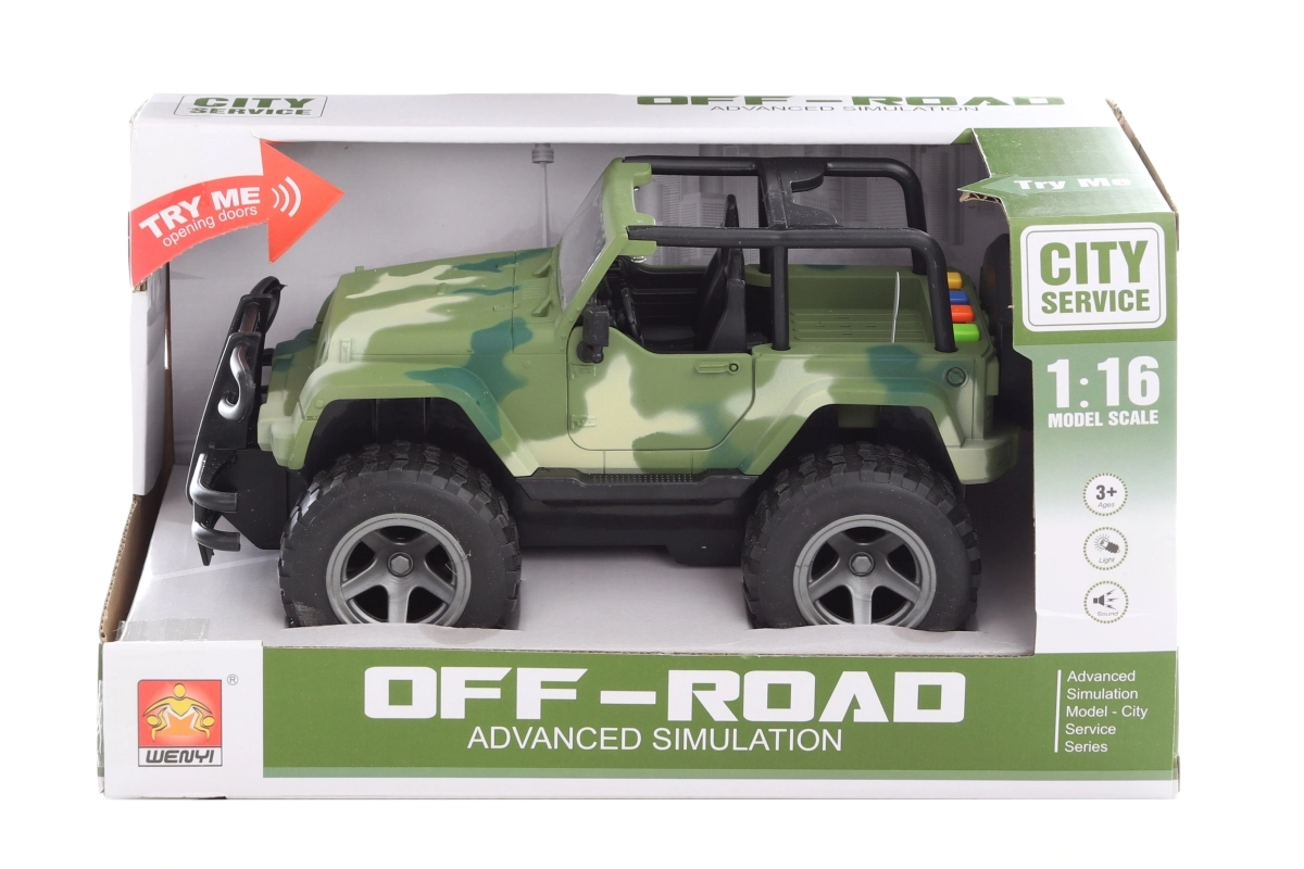Realistische plastic jeep op batterijen voor kleine avonturiers. Bij het indrukken van de knoppen op het dak gaat hij branden en maakt hij geluid, heeft openende deuren en compacte afmetingen voor comfortabel spelen thuis en buiten. In de verpakking zitten 3× AG13-batterijen.