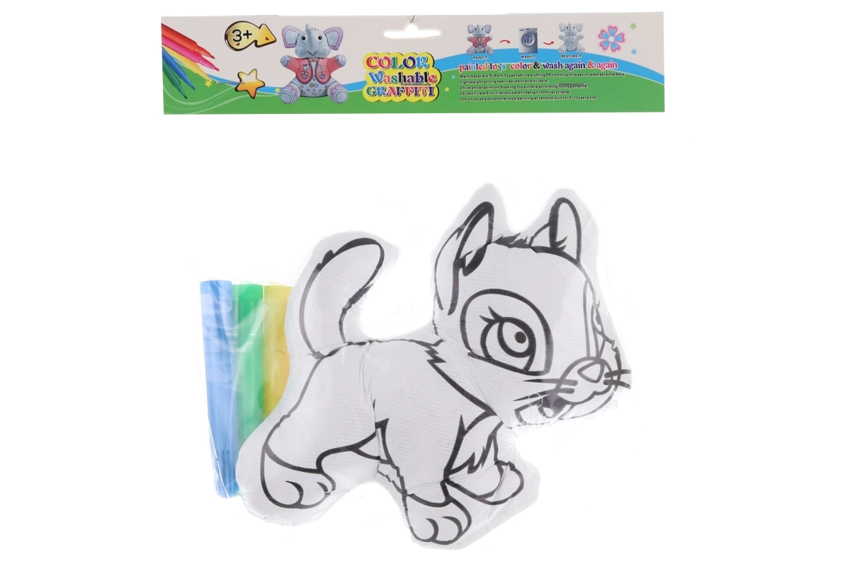 Leuk creatief speelgoed voor kinderen: een inkleerkat die kinderen kunnen inkleuren, wassen en daarna weer opnieuw versieren naar eigen fantasie. In de verpakking zitten 4 kleurrijke stiften. Het pluchen diertje van ca. 16 × 16 cm is gemaakt van polyester en is ideaal voor kinderen vanaf 3 jaar.