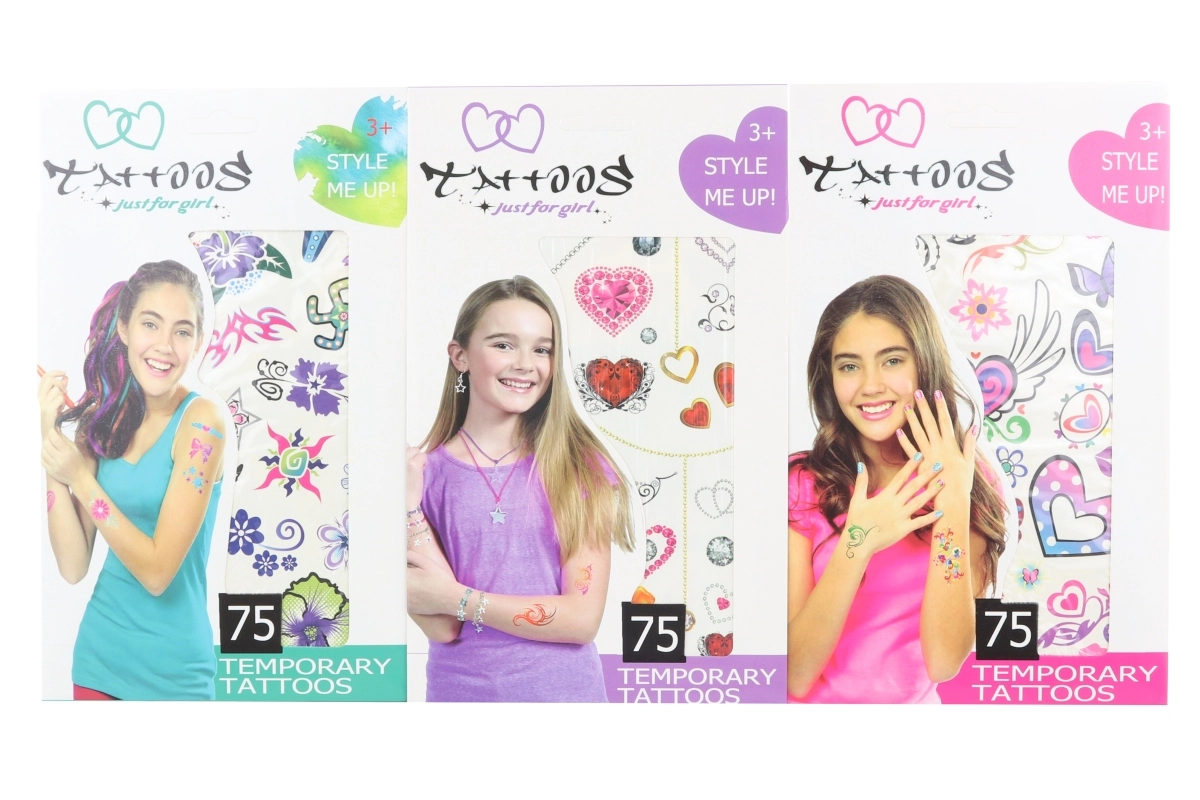 Prikkel de verbeelding van kinderen met deze set tijdelijke tatoeages voor meisjes. De set biedt 75 verschillende motieven, is eenvoudig aan te brengen en veilig te gebruiken voor kinderen vanaf 3 jaar. Ideaal voor feestjes, cadeaus en dagelijks plezier.