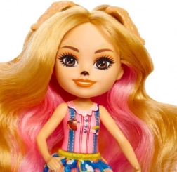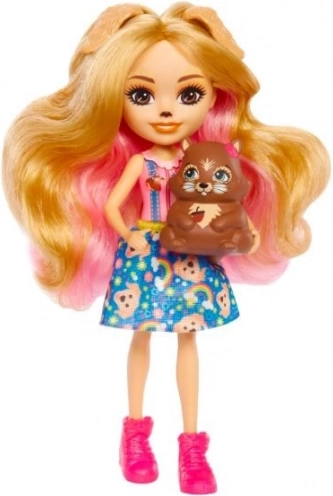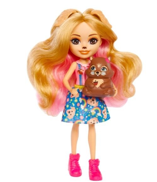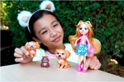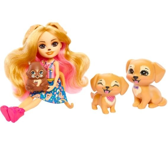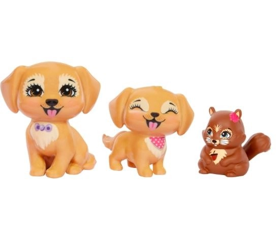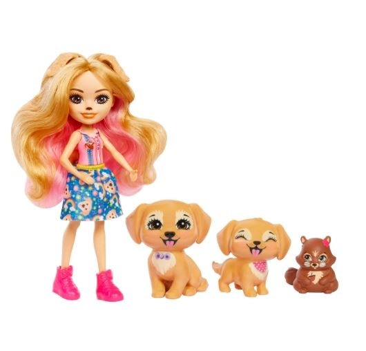 Ontdek de magische wereld van ENCHANTIMALS met de pop Gerika Golden Retriever en schattige huisdiertjes. De set bevat een pop van ca. 15 cm met lang roze-blond haar, bewegende ledematen en een stijlvolle outfit, plus twee puppy’s en een eekhoorn voor eindeloze verhalen en creatief spel.
