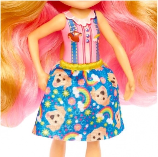 - Roze-blond haar, blauwe rok met honden- en regenboogmotieven, roze schoenen