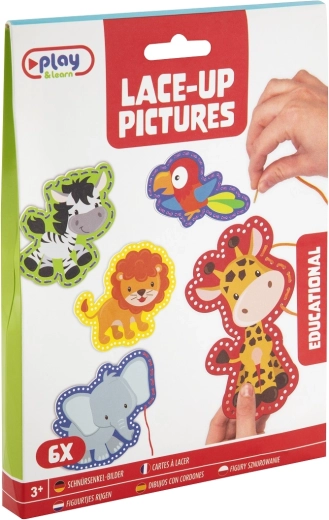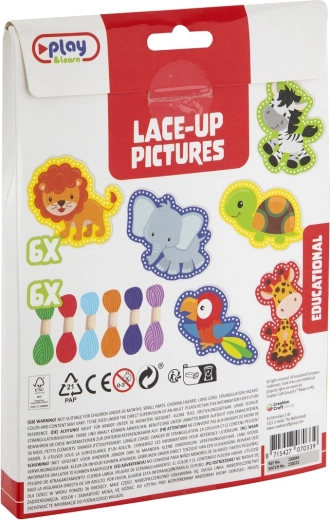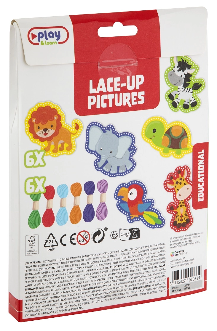 Elk van de 6 stevige afbeeldingen heeft voorgeperforeerde gaatjes voor eenvoudig rijgen, waardoor de activiteit ook geschikt is voor beginners. In de verpakking zitten 6 veters in verschillende kleuren – kies een afbeelding, rijg de veter en zie hoe het motief tot leven komt.