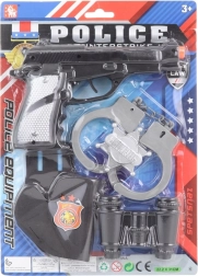 - Kunststof pistool (ca. 19,5 cm), pistoolholster, kunststof handboeien, verrekijker, badge