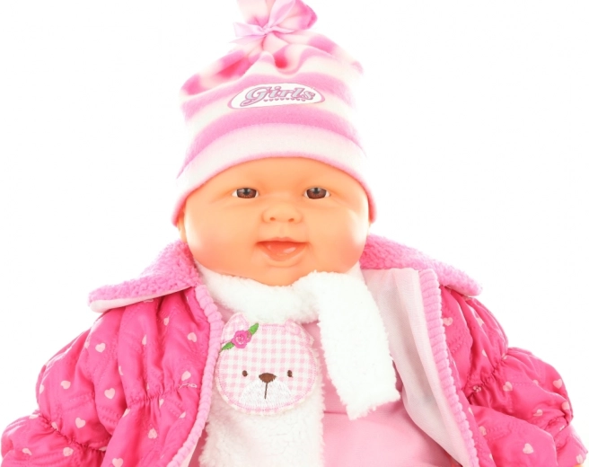 De pop heeft een gedetailleerd gezichtje en kleding van kwaliteitsstof in roze tinten, geschikt voor dagelijks spel en als cadeau. Afmeting ca. 52 × 30 × 13 cm voor prettig vasthouden, ook voor kleinere kinderhanden.