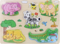 Ontdek de leuke houten inlegpuzzel met safari-motieven, die de fijne motoriek, het herkennen van vormen en dieren ontwikkelt en logisch denken stimuleert bij kinderen vanaf 3 jaar. De hoogwaardige houten uitvoering en kleurrijke illustraties nodigen uit om keer op keer te spelen.