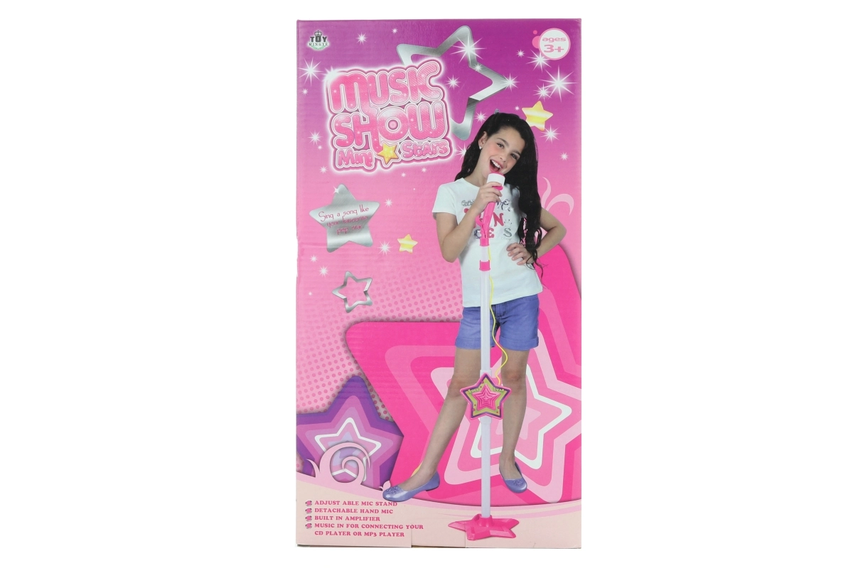 Start thuisconcerten met deze leuke microfoon voor kleine zangeressen. Inclusief stabiele standaard en de mogelijkheid om te verbinden met een MP3-speler voor het afspelen van favoriete liedjes. Voeding via 3× AA-batterijen (niet inbegrepen). Geschikt voor kinderen vanaf 3 jaar.