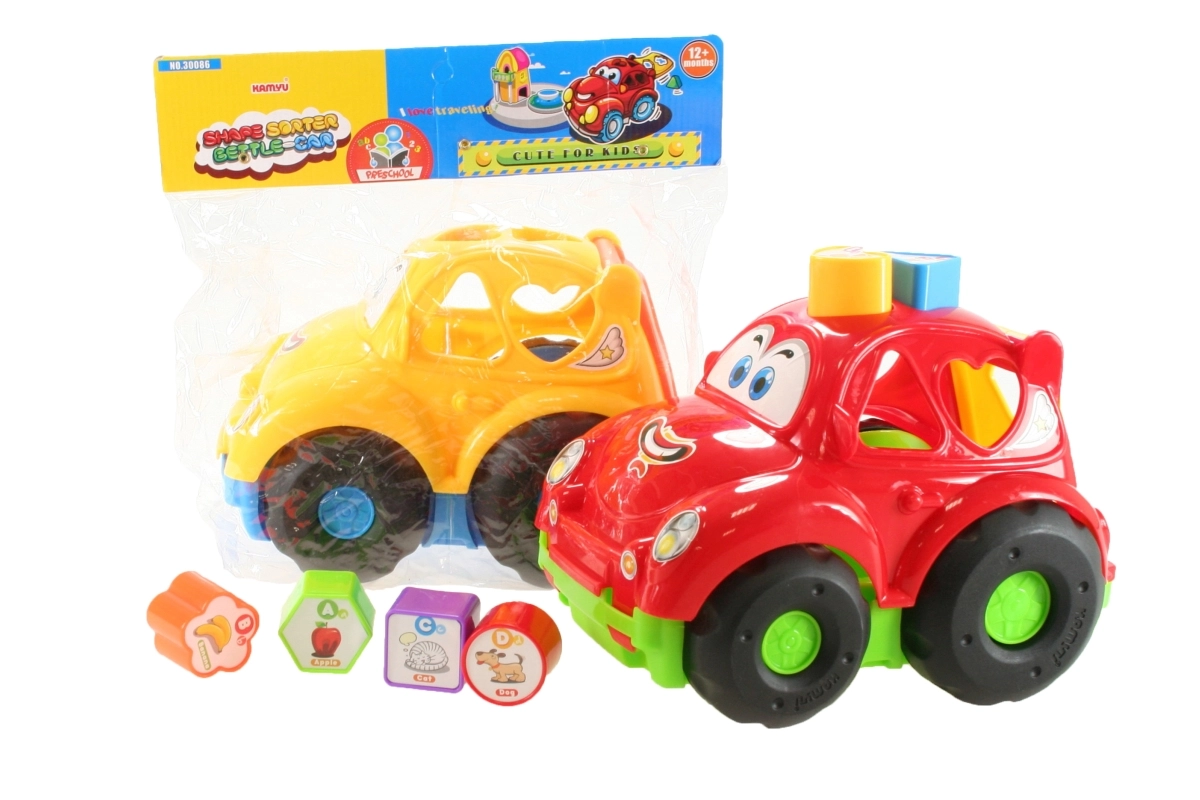 Vrolijke kunststof vormensorteerauto. Lengte van het autootje ca. 22 cm. Bevat 6 in te passen blokjes met letters en afbeeldingen. Leeftijd 12 maanden+