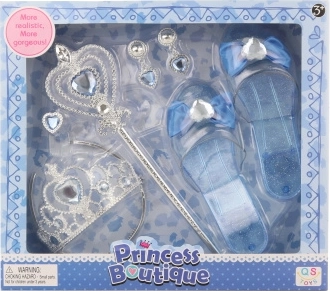 Prikkel de verbeelding van kinderen met de elegante prinsessen accessoireset, met alles voor een koninklijke verkleedpartij: muiltjes, kroontje, scepter, ring en oorbellen. Ideaal voor kinderspel, carnaval en verkleden thuis.