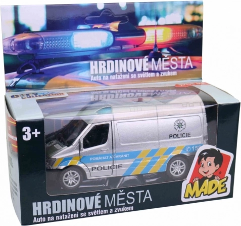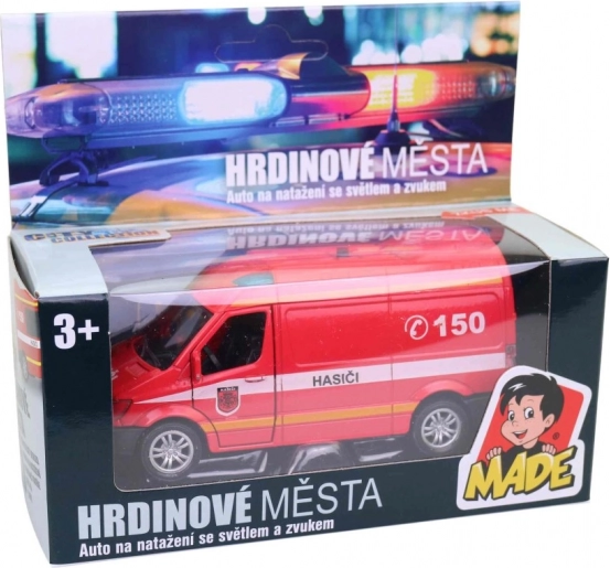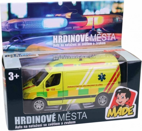 Reddingsautootje Stadshelden met licht en geluid, pull-back aandrijving. 3 soorten: ambulance, politie, brandweer. Voeding 2× LR41.