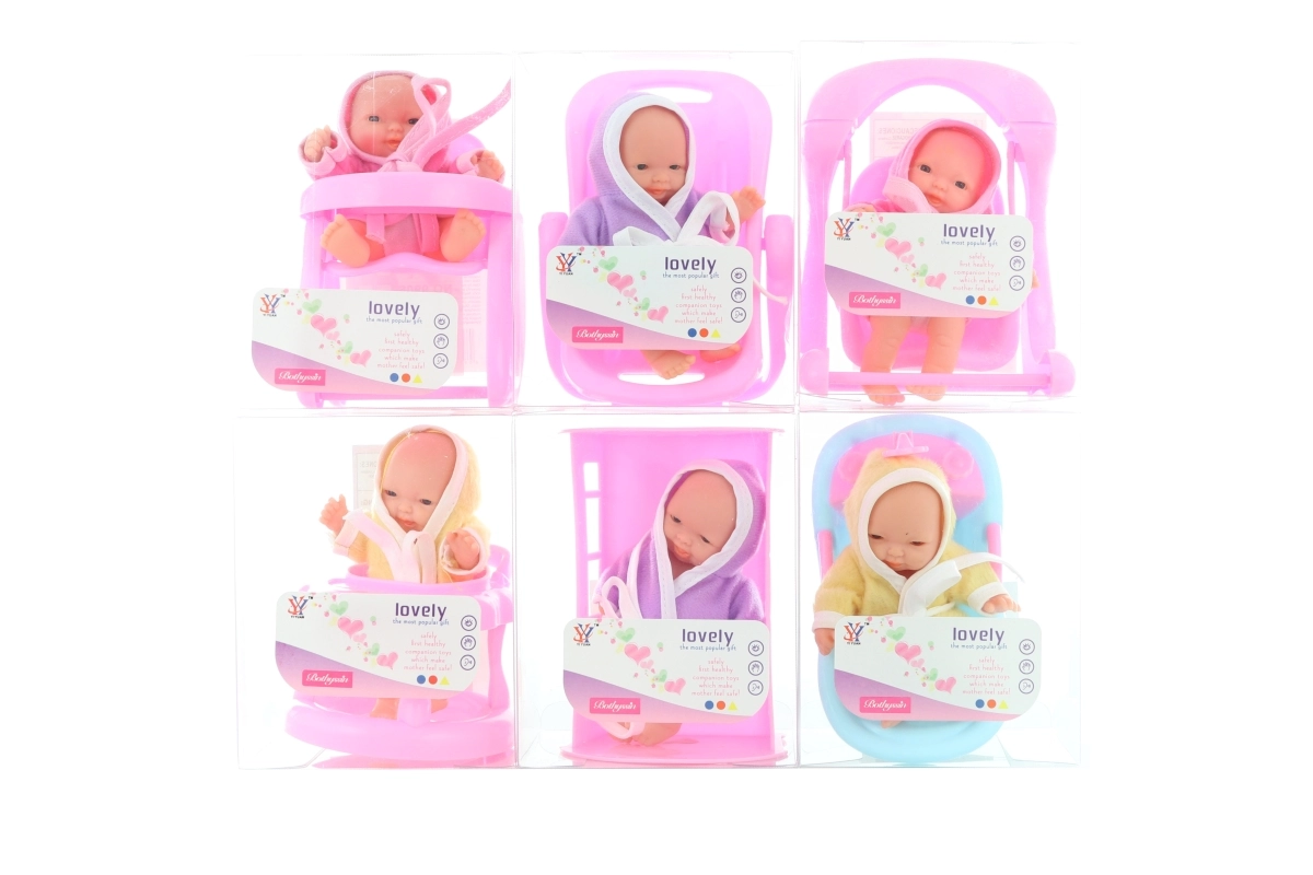 Schattige baby met diverse accessoires voor creatief spel. Elke baby heeft zijn eigen item (stoeltje, badje, bedje, loopstoeltje e.d.) en een outfit, ideaal voor kleine verzorgers. Compact formaat van ca. 10 cm past perfect in kinderhandjes. Geschikt voor kinderen vanaf 3 jaar.