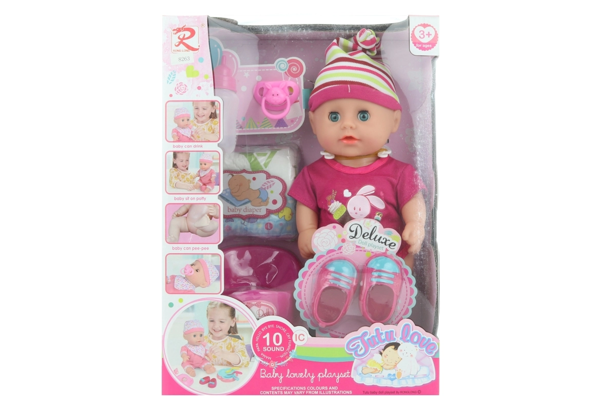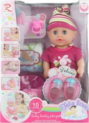 Schattige babypop van 30 cm die na het plaatsen van batterijen realistische geluiden maakt en kan plassen. In de verpakking vind je een uitgebreide set accessoires, waaronder schoentjes, een plastic slabbetje, een flesje en een bordje. Batterijen zijn inbegrepen, zodat kinderen meteen na het uitpakken kunnen spelen.