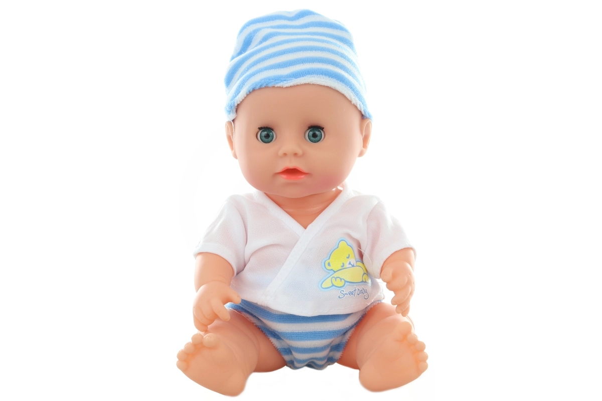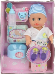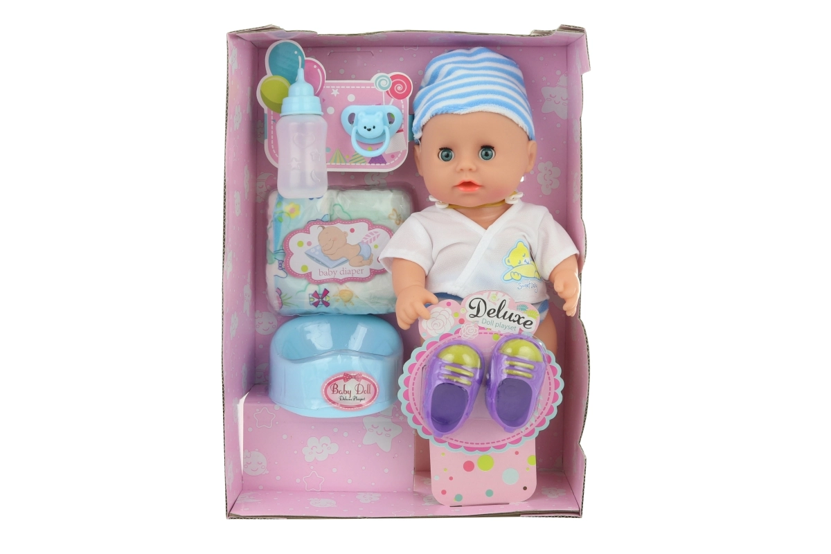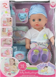 Een schattige baby van 30 cm hoog zal elke kleine verzorger blij maken. Na het plaatsen van batterijen maakt hij realistische geluiden en kan hij plassen. De set bevat schoentjes, slabbetje, flesje, bordje en andere accessoires om papa of mama na te spelen. Ideaal voor kinderen vanaf 3 jaar.