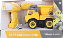 Deze kiepwagen uit de serie stedelijke techniek ontwikkelt spelenderwijs de vaardigheden van kinderen: eerst zetten ze de wagen in elkaar met de meegeleverde schroevendraaier of boor, daarna plaatsen ze de motor uit de boor in de auto en gaan ze aan het werk. Eenvoudige bediening vooruit/achteruit, geluidseffecten en een stevige constructie prikkelen de verbeelding en de hand-oogcoördinatie.