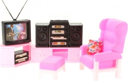 De set is gemaakt van duurzaam plastic en bevat een comfortabele fauteuil met voetenbank, een praktische woonkamerwand met deurtjes, een hoekkast en multimedia-uitrusting. Compacte afmetingen van de onderdelen maken hanteren en opbergen eenvoudig.