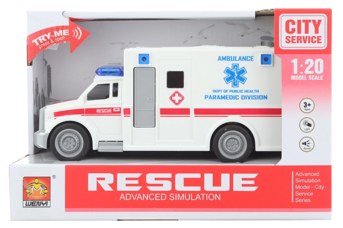 Realistische plastic ambulance die kleine hulpverleners vanaf 3 jaar zal verrassen. Bij het indrukken van de knoppen op het dak brandt het licht en maakt hij geluid, hij heeft openende deuren en is direct klaar voor actie na het uitpakken – batterijen zijn inbegrepen.