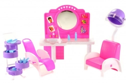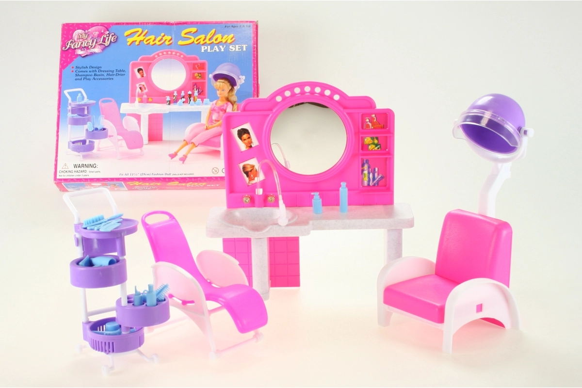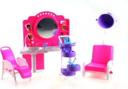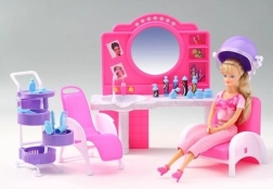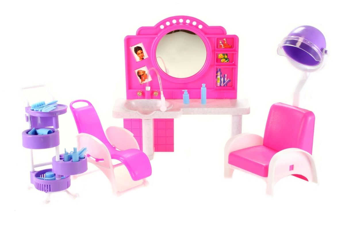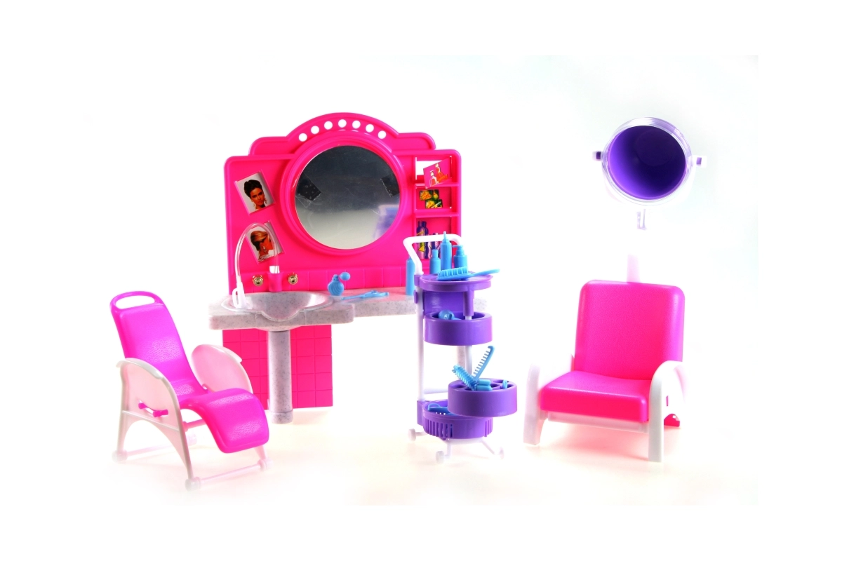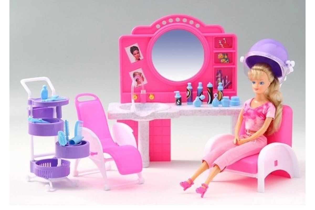 De stijlvolle speelset Glorie kapperssalon bezorgt kinderen veel plezier bij het naspelen van een kapsalon. Bevat een kaptafel met spiegel en wasbak, comfortabele kappersstoelen, een trolley met vakjes en allerlei accessoires voor haarstyling, zoals kammetjes, borstels en flesjes. Gemaakt van duurzaam plastic. Pop niet inbegrepen. Geschikt voor kinderen vanaf 3 jaar.