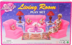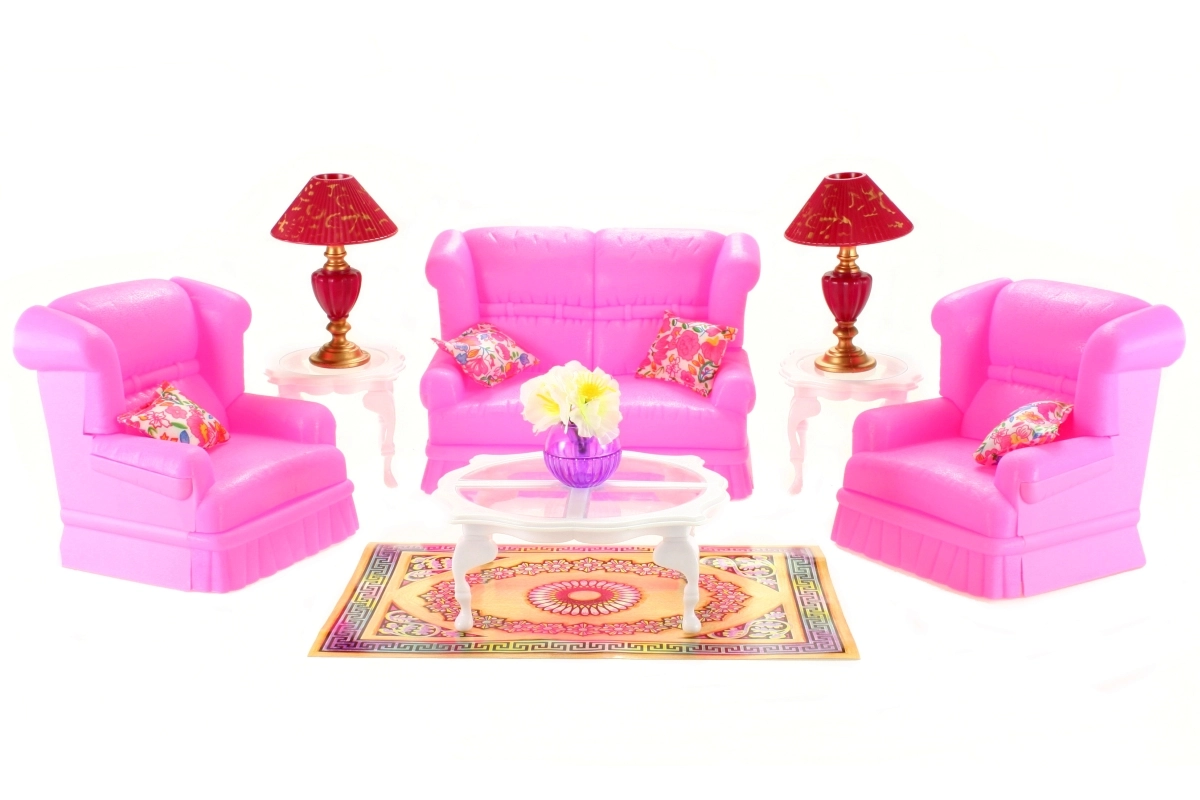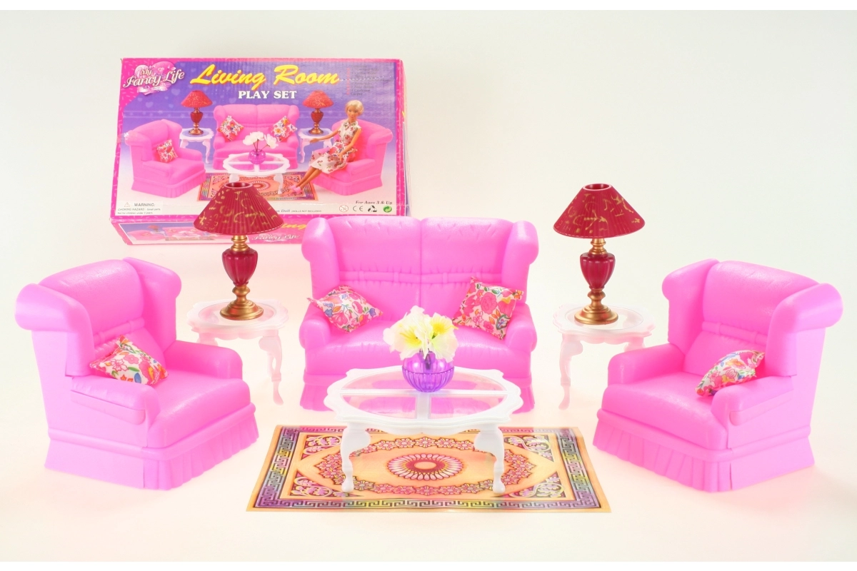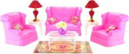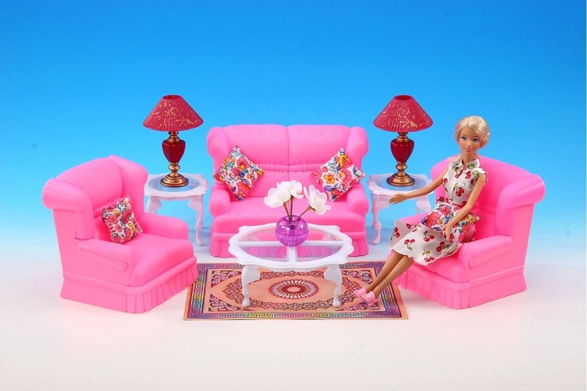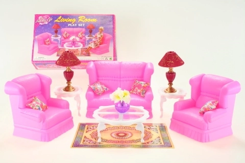 De stijlvolle GLORIE woonkamer-set voor poppen verandert elk poppenhuis in een knus thuis. Bevat een bank, twee fauteuils, salontafel en bijzettafels, lampen en decoraties. Ideaal voor creatieve spelletjes en het stimuleren van de fantasie. Complete woonkamerinrichting, gedetailleerde accessoires en duurzaam kunststof materiaal waar kinderen vanaf 3 jaar blij van worden.