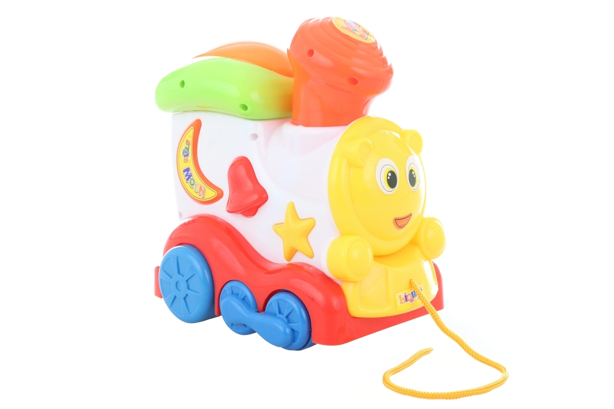 Deze kleurrijke pieplocomotief maakt elk nieuwsgierig kind blij. Bij het voorttrekken én bij het indrukken van de schoorsteen klinkt een piepgeluid, dat de zintuiglijke waarneming ondersteunt en tot bewegen motiveert. Dankzij de compacte afmetingen is hij eenvoudig te hanteren en geschikt om thuis én onderweg mee te spelen.