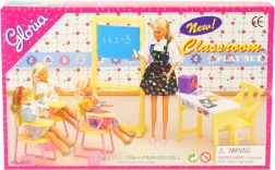 Creëer thuis een eigen schoolsfeer met de set Glorie klaslokaal. Deze rijk uitgeruste set biedt een schoolbord, leraarstafel en -stoel, 3 stoelen met armleuningen, een computer met toetsenbord, tassen en papieren schriftjes en toetsen. Ideaal voor creatief spel en het stimuleren van de verbeelding van kinderen. Poppen zijn niet inbegrepen.