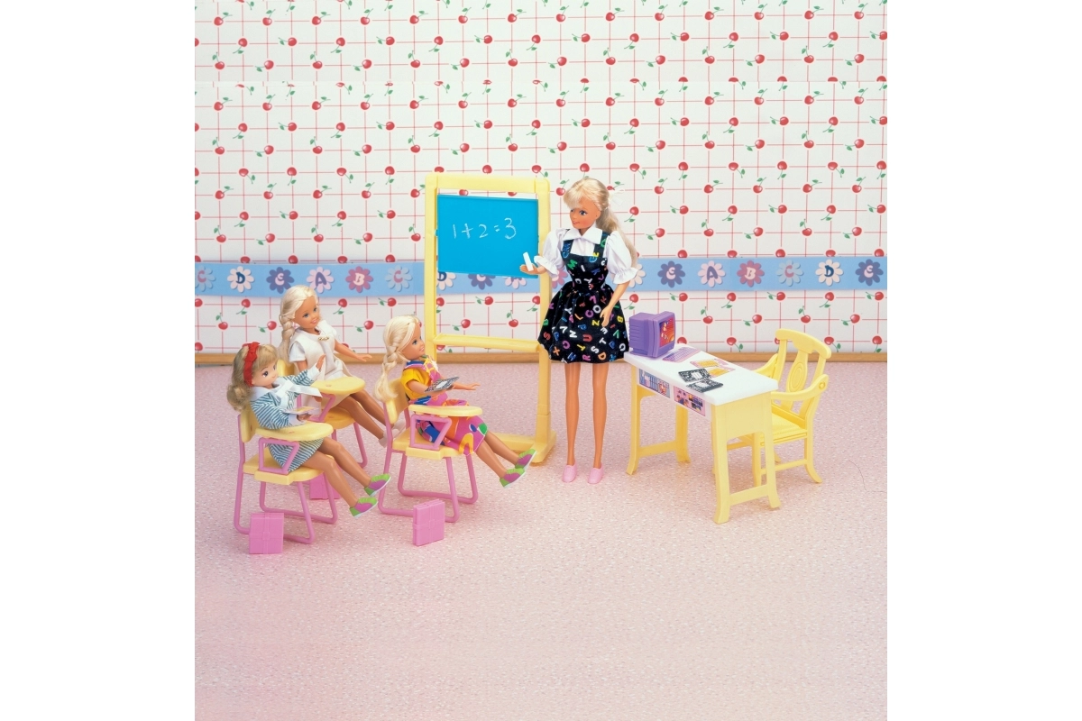 De set bevat een ruim schoolbord, een lerarenhoek met computer en stoelen voor leerlingen. Dankzij de compacte afmetingen is de set compatibel met gangbare poppen en eenvoudig op te bergen.