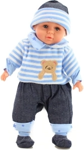 Baby met een zacht lijfje. De baby draagt een kleurrijke pyjama die kan worden uitgetrokken (klittenbandsluiting). Afmetingen van de baby ca. 35 x 17 x 8 cm. Verpakt in een plastic zak. Leeftijd 3+.