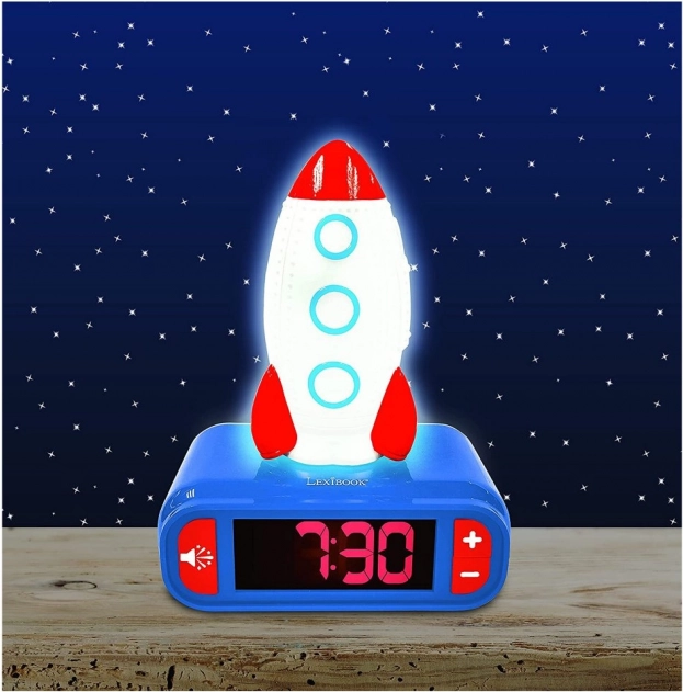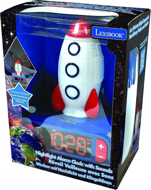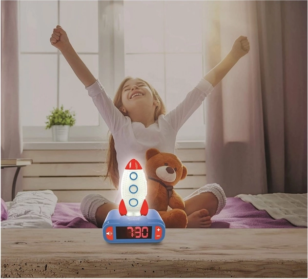 Deze charmante raketvormige wekker is ontworpen om niet alleen een leuke toevoeging aan de kinderkamer te zijn, maar ook een nuttige hulp. Met intuïtieve bedieningsknoppen kan je kind zelf de tijd en het alarm instellen in 12/24-uursmodus. Het achtergrondverlichte LCD-scherm zorgt ervoor dat het kind zich gemakkelijk kan oriënteren zonder in slaap te worden gestoord. De wekker biedt zes verschillende thematische tonen en de mogelijkheid om geluidseffecten toe te voegen voor nog meer plezier bij het wakker worden.