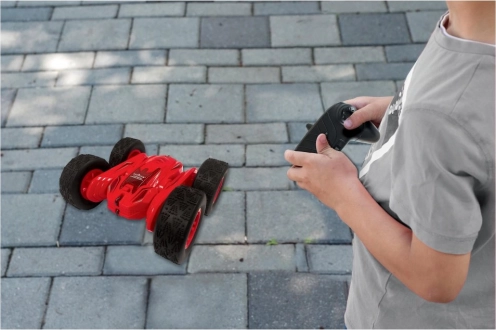 De auto haalt snelheden tot 12 km/u en de robuuste constructie met rubberen banden zorgt voor grip op verschillende ondergronden. In de demomodus toont hij voorgeprogrammeerde trucs met één druk op de knop. De oplaadbare batterij biedt tot 20 minuten rijtijd en wordt via een USB-kabel (meegeleverd) in ongeveer 210 minuten opgeladen.