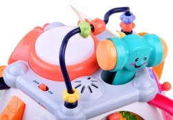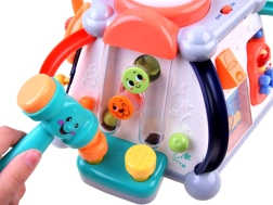 - Zijde met hamertje: sla op de knoppen om een balletje door een transparante tunnel te laten bewegen, begeleid door geluiden en licht; daarnaast een beweegbare banaan en appel aan een zelfoprollend koord.