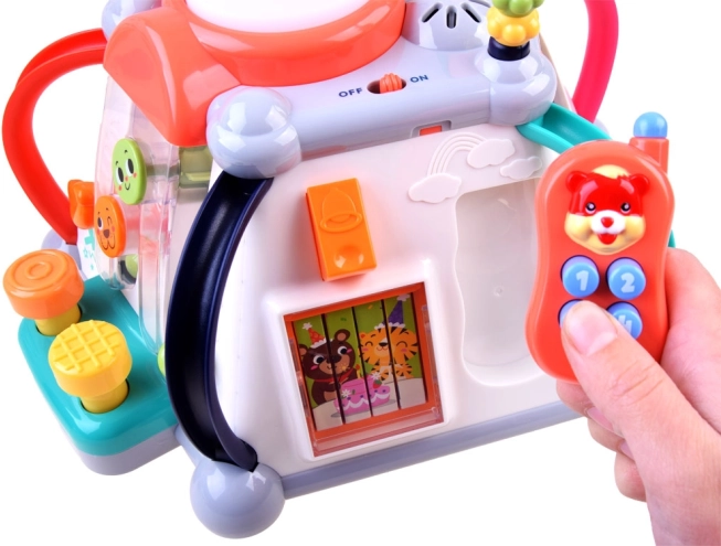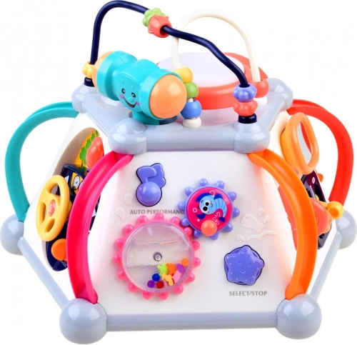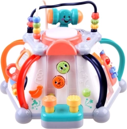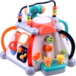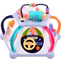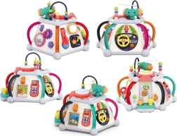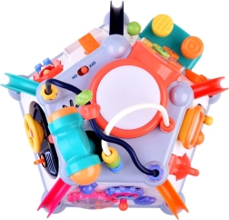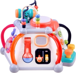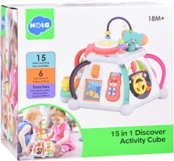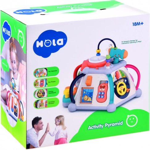 De HOLA multikubus biedt een rijke variatie aan activiteiten voor de allerkleinsten. Elke zijde biedt een ander type spel – van autorijden tot tandwielen met licht en melodieën en een microfoon met een verlicht “televisiescherm”. De bovenkant verbergt kralenlabyrinten, een lichtgevende trommel en een plek om de hamer op te bergen. Alles is ontworpen voor kleine kinderhandjes en veilig ontdekken.
