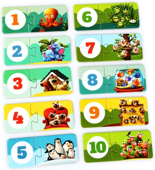 Ontdek spelend leren met de PUZZLIKA-puzzel, die kinderen begeleidt bij hun eerste stappen in de wereld van cijfers. Elk paar verbindt een illustratie van een groepje dieren met het bijbehorende cijfer, wat op natuurlijke wijze tellen van 1 tot 10, visuele waarneming en het leggen van verbanden ontwikkelt. De grote en stevige stukjes zijn makkelijk vast te pakken en te leggen.