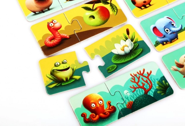 De set bevat 20 stevige stukjes die 10 thematische paren vormen. De illustraties zijn duidelijk en kleurrijk om de aandacht vast te houden en tot ontdekken te motiveren. Hoogwaardig, milieuvriendelijk karton met glanzende afwerking is duurzaam en kan worden afgenomen met een vochtige doek.