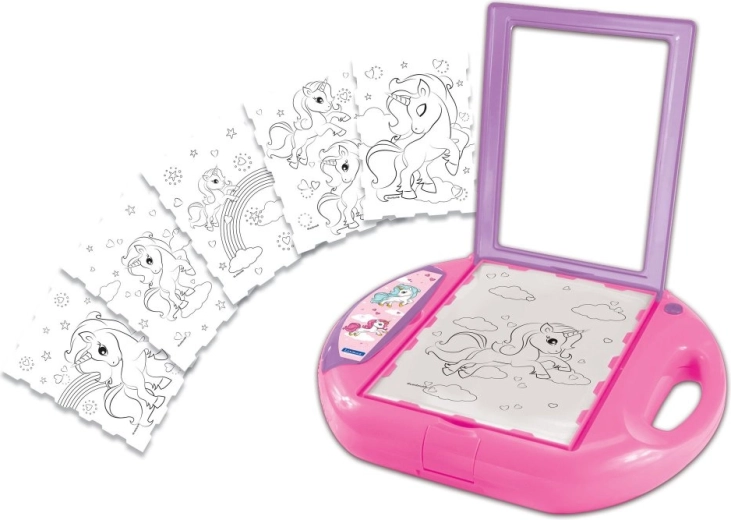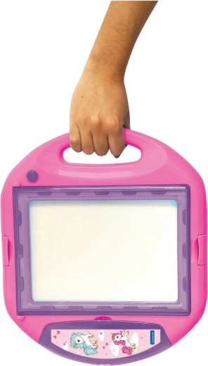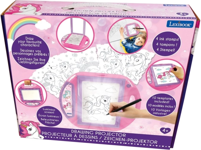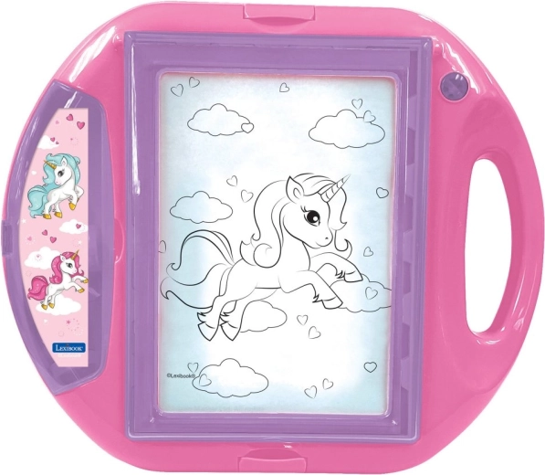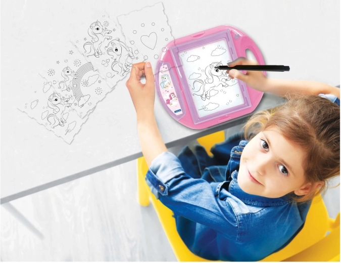 De A5-tekenprojector wordt geleverd met 10 sjablonen en 4 stempels met een sprookjesachtige eenhoorn. Hij helpt kleine kunstenaars leren tekenen terwijl ze plezier hebben. Dankzij het verlichte scherm en de praktische instellingen is hij zeer eenvoudig te bedienen, en alle accessoires kunnen erin worden opgeborgen zodat je alles netjes kunt meenemen. Plaats een van de sjablonen onder de kunststof afdekking, leg er papier op, sluit het deksel en teken. Het scherm licht op om de sjabloon onder het papier te tonen en het kind te begeleiden tijdens het tekenen.
