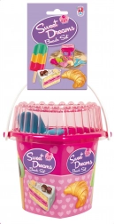 - Hartvormige emmer met deksel, schep, harkje, 4 vormpjes (softijs, ijsje op stok, ruitentaart, croissant)