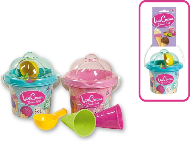 Door de compacte afmetingen past de set gemakkelijk in de kinderwagen of strandtas. Het emmertje met deksel in de vorm van een ijscoupe houdt alles bij elkaar en dient tegelijk als speels element tijdens het spel.