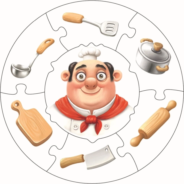 Illustratie van een kok met keukengerei (pollepel, pan, deegroller) die helpt bij de ontwikkeling van logisch denken en het herkennen van alledaagse handelingen.