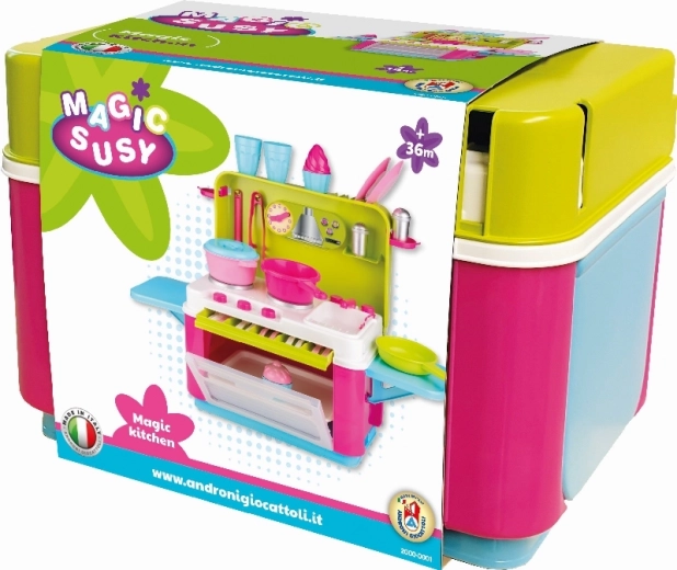 Het compacte reiskeukentje van het Italiaanse merk ANDRONI maakt jonge koks vanaf 3 jaar blij. Het biedt 25 accessoires, hoogwaardige Italiaanse afwerking en stevige, tegelijk flexibele kunststofmaterialen die ook geschikt zijn voor intensief gebruik in kleuterscholen.
