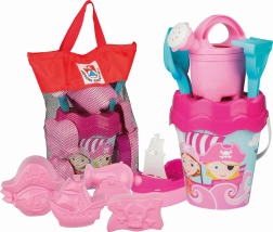 - Emmer (Ø 17 cm), zeef, gieter 0,5 l, schepje, harkje, piratenbootje, 4 vormpjes