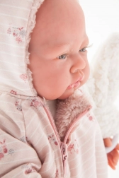 Deze handgemaakte realistische Reborn-pop valt op door haar levensechte uiterlijk: subtiel rozige huidplooitjes, met de hand aangezette haartjes, adertjes en gelaatdetails. De speciale afwerking met een “licht donzige” huid versterkt de tactiele beleving. De pop heeft een zacht stoffen lijfje en een hoofd en ledematen van hoogwaardig verzacht vinyl voor een natuurlijke feel bij het vasthouden.
