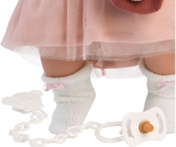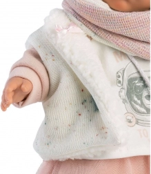 Pop van de Llorens-fabriek is een garantie voor kwalitatief en veilig plezier. Ze is met maximale precisie gemaakt en gebruikt alleen stoffen van gerenommeerde merken. Julia kan huilen en 'mama' en 'papa' zeggen als je haar fopspeen eruit haalt. Haar prachtige uitstraling wordt aangevuld met stijlvolle kleding: een tweekleurige sweatshirt met print, een tule rok, een bontvest, witte sokken met strikken en een roze sjaal, wat zorgt voor een perfecte outfit die uren speelplezier garandeert.